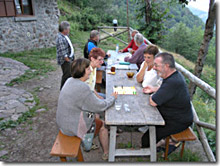 kleinen Plateau vor der Hütte mit Blick ins Tal, auf die Berge, den