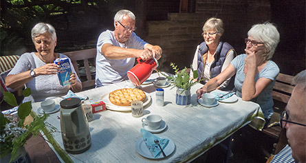 Bei Pflaumen- und Apfelkuchen mit einer guten Tasse Kaffee