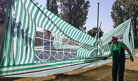 starken Windes, eines unserer Zelte über den Zaun. Es war