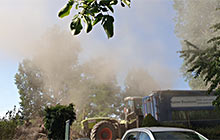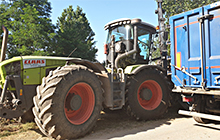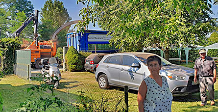 Traktor mit angehängtem Häcksler direkt vor dem Grundstück