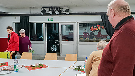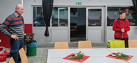 Tische aufgestellt und weihnachtlich geschmückt waren,