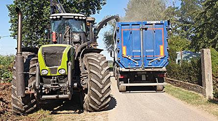 Traktor mit angehängtem Häcksler direkt vor dem Grundstück
